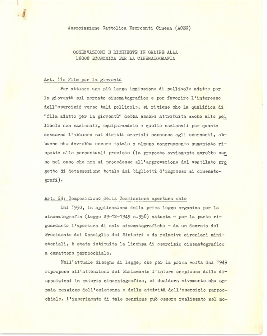 "Osservazioni e richieste in ordine alla legge economica per la cinematografia"