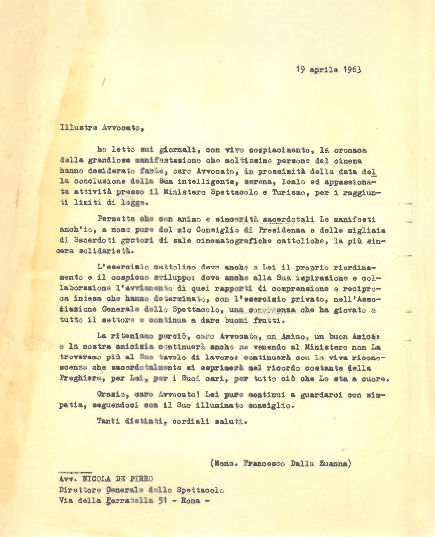 Lettera di mons. Francesco Dalla Zuanna, presidente dell'ACEC, all'avv. Nicola De Pirro, direttore generale dello spettacolo