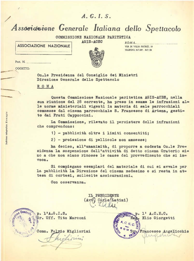 Segnalazione delle infrazioni alle norme ministeriali vigenti in materia di sale parrocchiali commesse dal cinema parrocchiale San Francesco di Artena in provincia di Roma. Allegato un ritaglio di stampa recante la programmazione della sala. Dattiloscritto