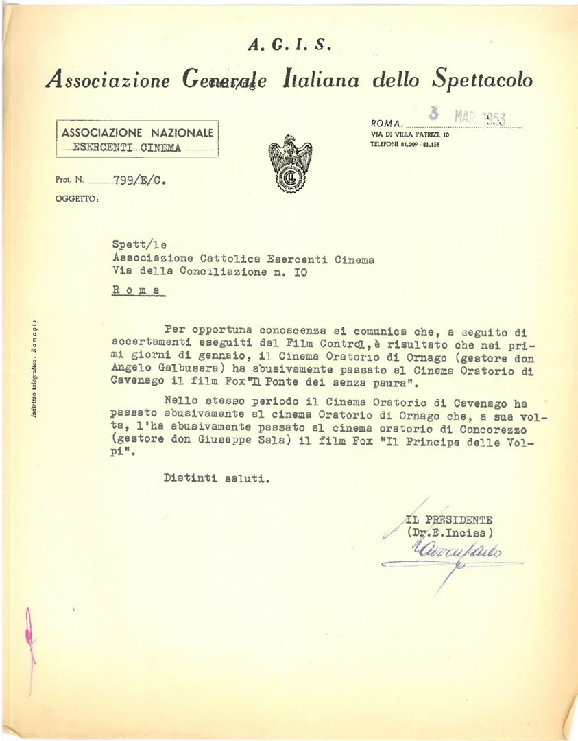 Lettera di Edmondo Incisa di Camerana, presidente dell'Associazione nazionale esercenti cinema - ANEC, all'ACEC