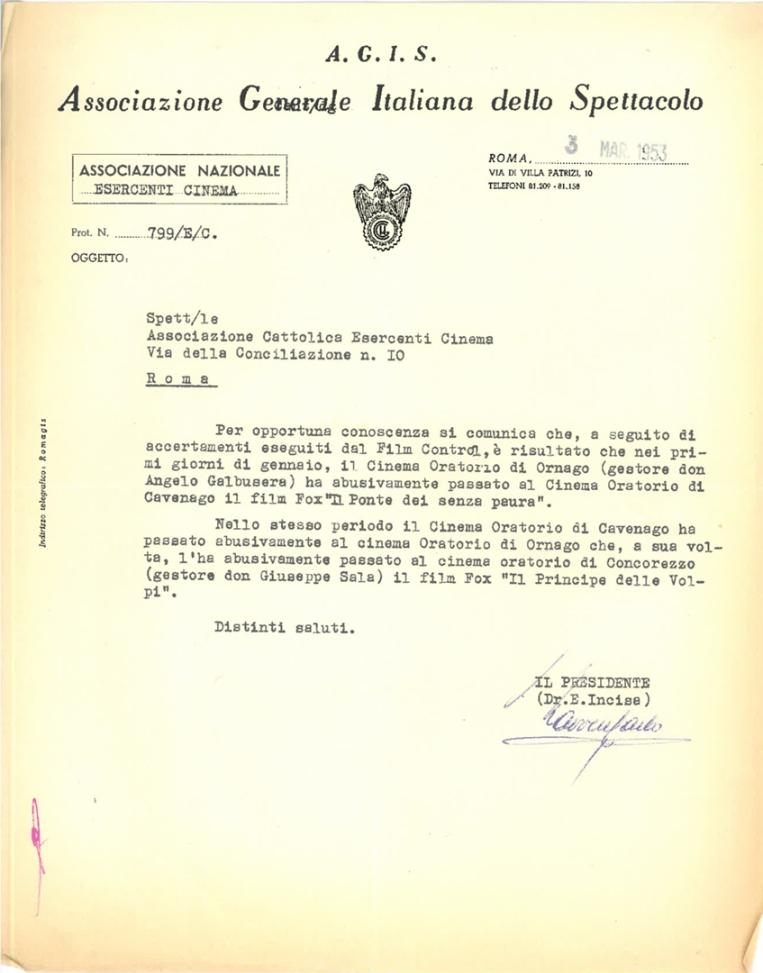 Comunicazione relativa alla proiezione abusiva dei film "Il ponte dei senza paura" e "Il principe delle volpi" presso i cinema oratorio di Ornago e Concorezzo