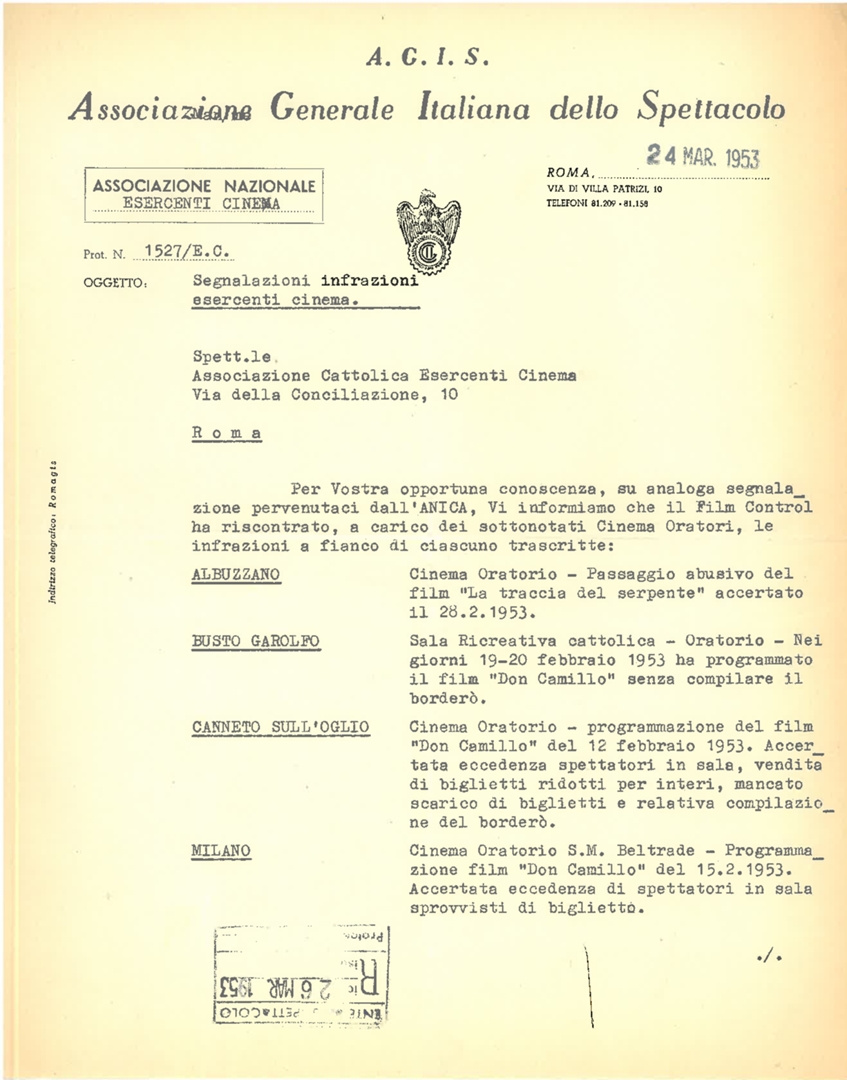 Edmondo Incisa di Camerana segnala l'irregolare attività di alcuni cinema parrocchiali (Albuzzano, Busto Garolfo, Canneto sull'Oglio, Milano, Cologne, Bottanaga, Cantù, Bosisio Parini, Gratasoglio, Rozzato). Dattiloscritto