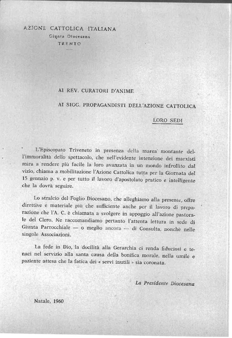 La Giunta diocesana dell'Azione cattolica italiana di Trento denuncia l'immoralità del mondo dello spettacolo e segnala ai parroci e ai suoi propagandisti la necessità di una bonifica morale. Testo a stampa