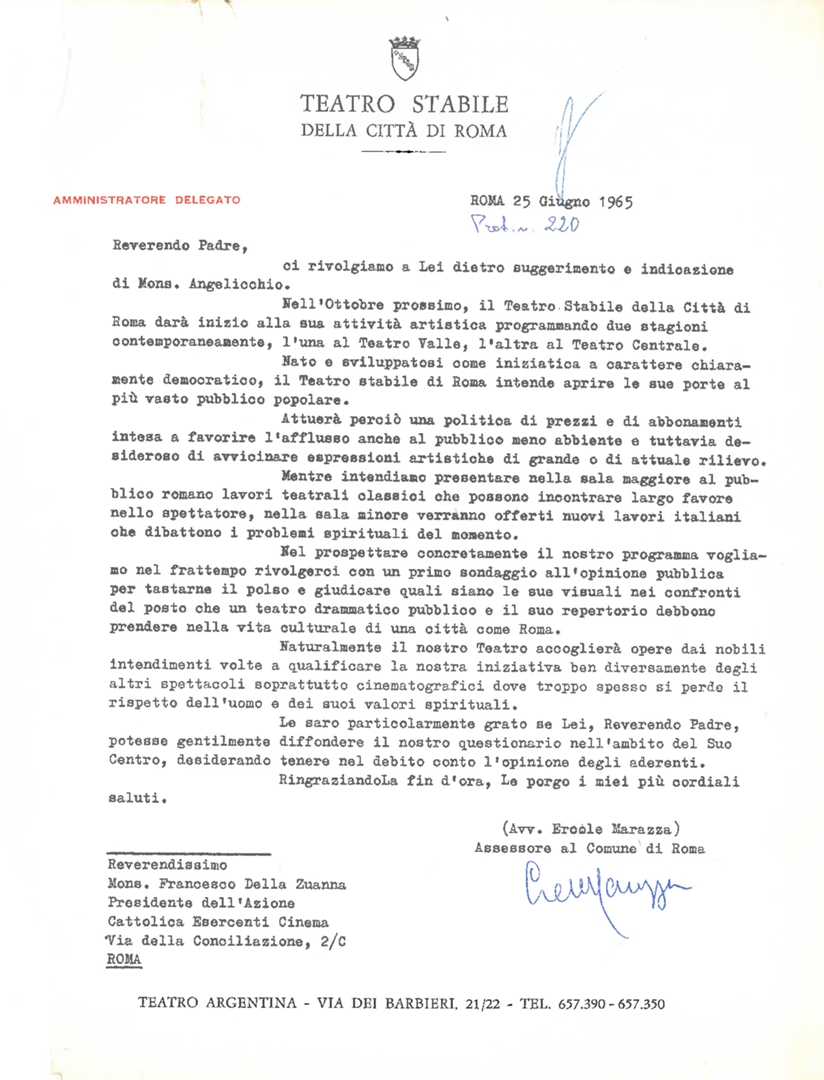 Lettera dell'avv. Ercole Marazza, assessore al Comune di Roma e amministratore delegato del Teatro stabile della città di Roma, a mons. Francesco Dalla Zuanna, presidente dell'ACEC