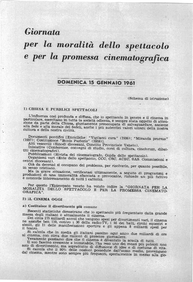 "Giornata per la moralità dello spettacolo e per la promessa cinematografica, domenica 15 gennaio 1961 (schema di istruzione)"