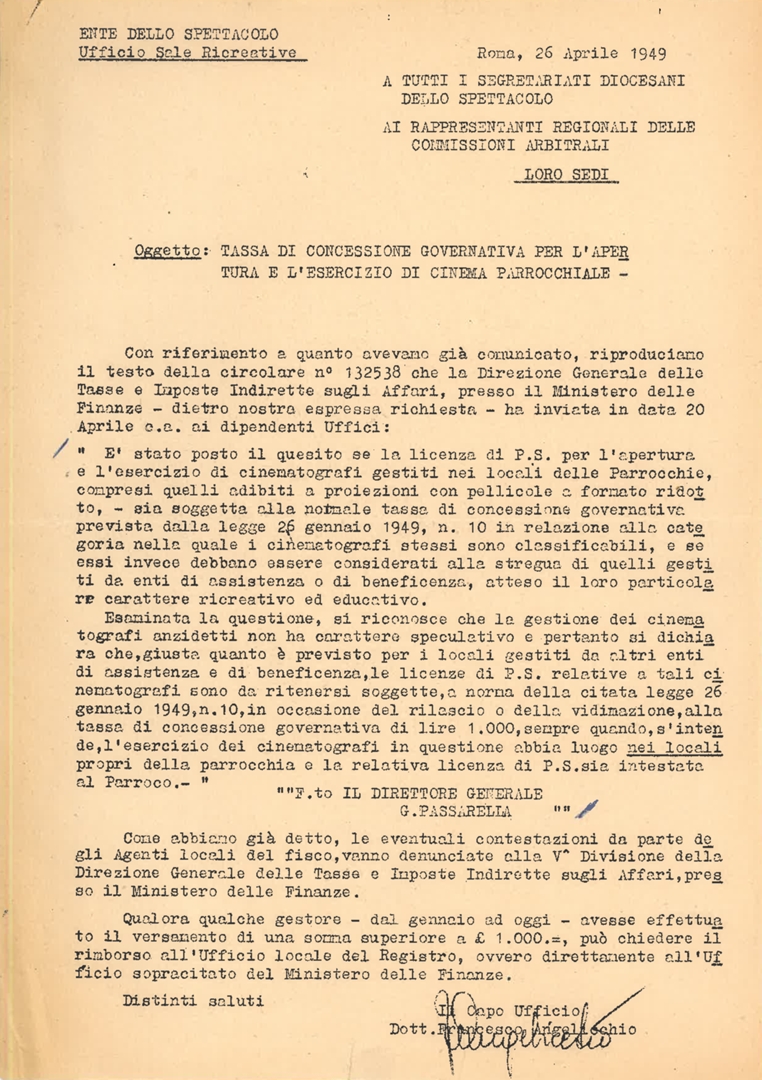 Don Francesco Angelicchio scrive in merito alla tassa di concessione governativa per l'apertura e l'esercizio di cinema parrocchiale. Dattiloscritto