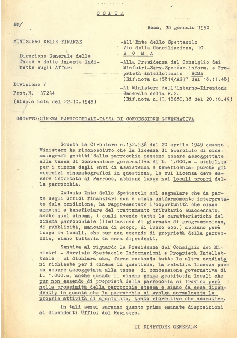 Il direttore generale delle tasse e imposte indirette sugli affari scrive all'Ente dello spettacolo in merito alla tassa di concessione governativa per l'apertura di cinema parrocchiale. Dattiloscritto
