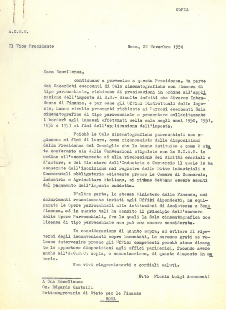 Floris Luigi Ammannati scrive all'on. Edgardo Castelli in merito all'esonero delle sale cinematografiche parrocchiali dal pagamento dell'imposta governativa. Dattiloscritto
