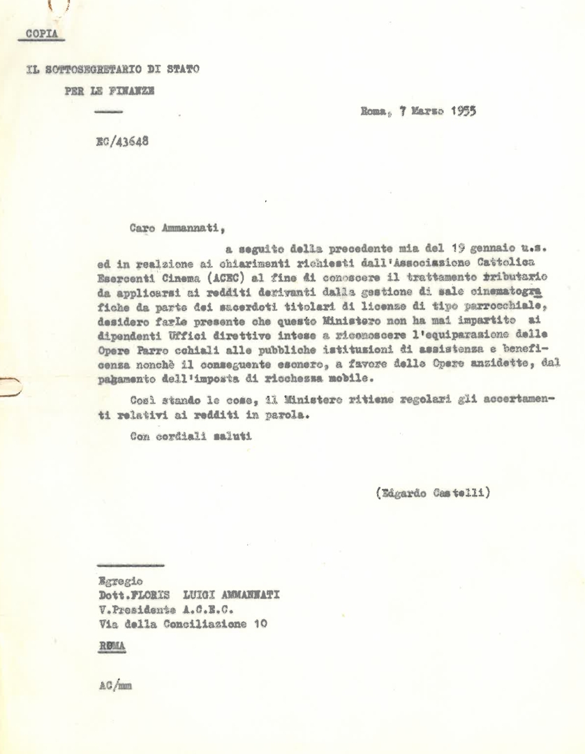 L'on. Edgardo Castelli risponde a Floris Luigi Ammannati in merito al trattamento tributario da applicarsi alle sale cinematografiche parrocchiali. Dattiloscritto