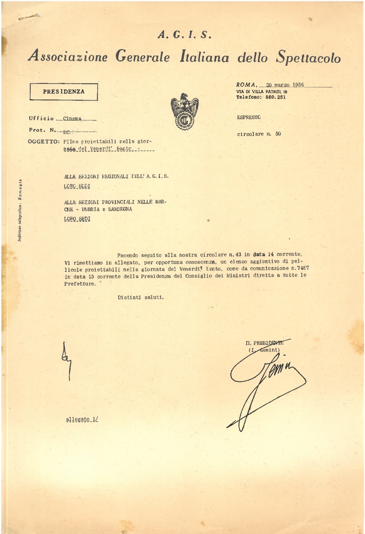 Elenco dei film, con lettera di trasmissione di Italo Gemini, presidente dell'Associazione generale italiana dello spettacolo - AGIS, alle sezioni regionali dell'AGIS e alle sezioni provinciali nelle Marche, Umbria e Sardegna. Dattiloscritto