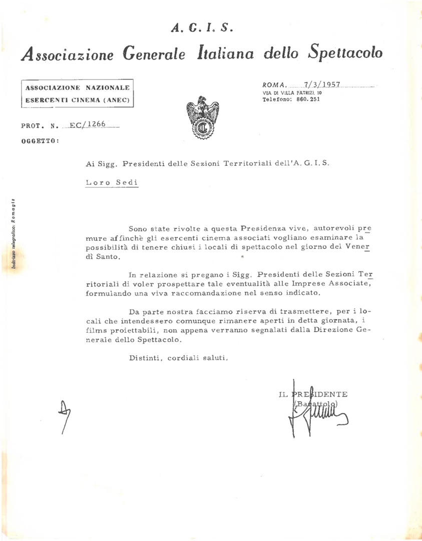 Vincenzo Barattolo scrive in merito alla possibilità di tenere chiuse le sale cinematografiche nel giorno di venerdì santo. Dattiloscritto