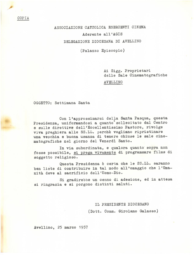 Lettera di don Girolamo Galasso, presidente della delegazione diocesana di Avellino, ai proprietari delle sale cinematografiche della città
