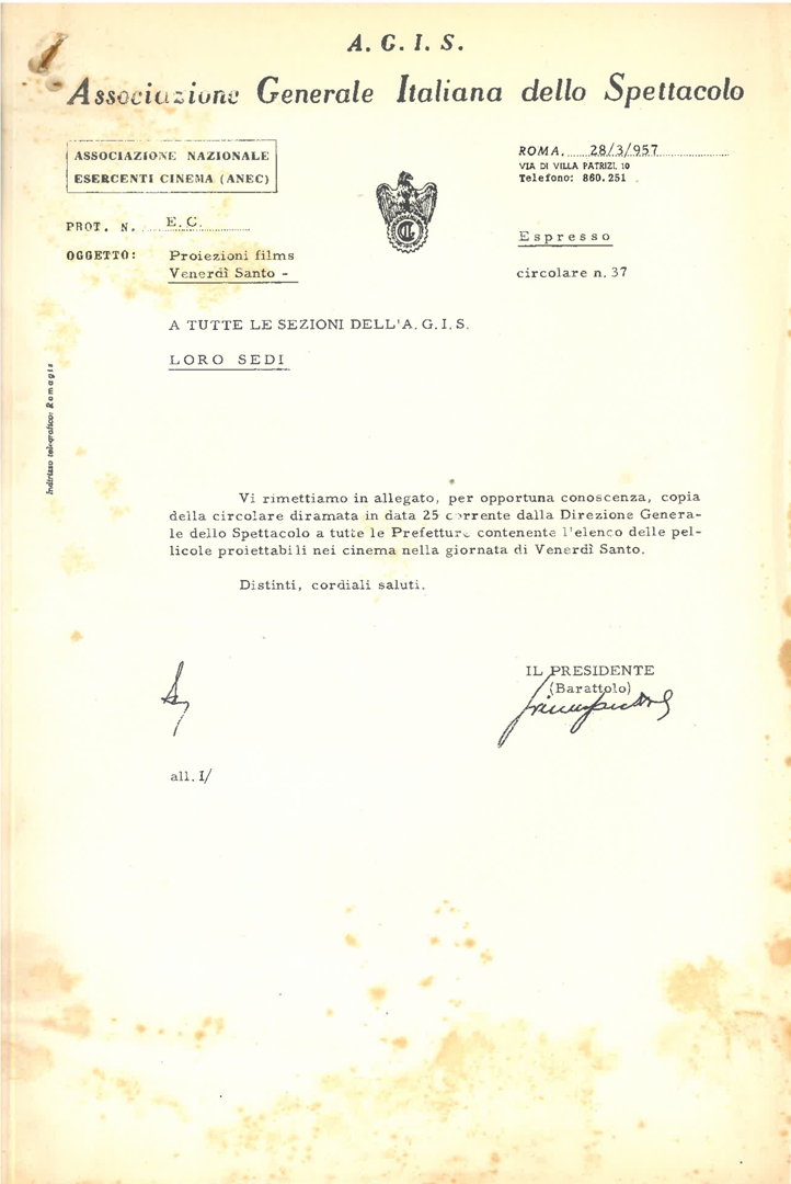 Copia della circolare diramata in data 25 marzo 1957 dalla Direzione generale dello spettacolo a tutte le prefetture, contenente l'elenco delle pellicole proiettabili nei cinema nella giornata del venerdì santo