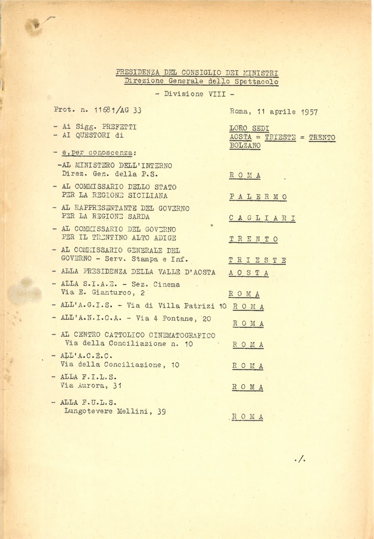 Con lettera di trasmissione della Direzione generale dello spettacolo alle prefetture e alle questure di Aosta, Trieste, Trento e Bolzano. Dattiloscritto