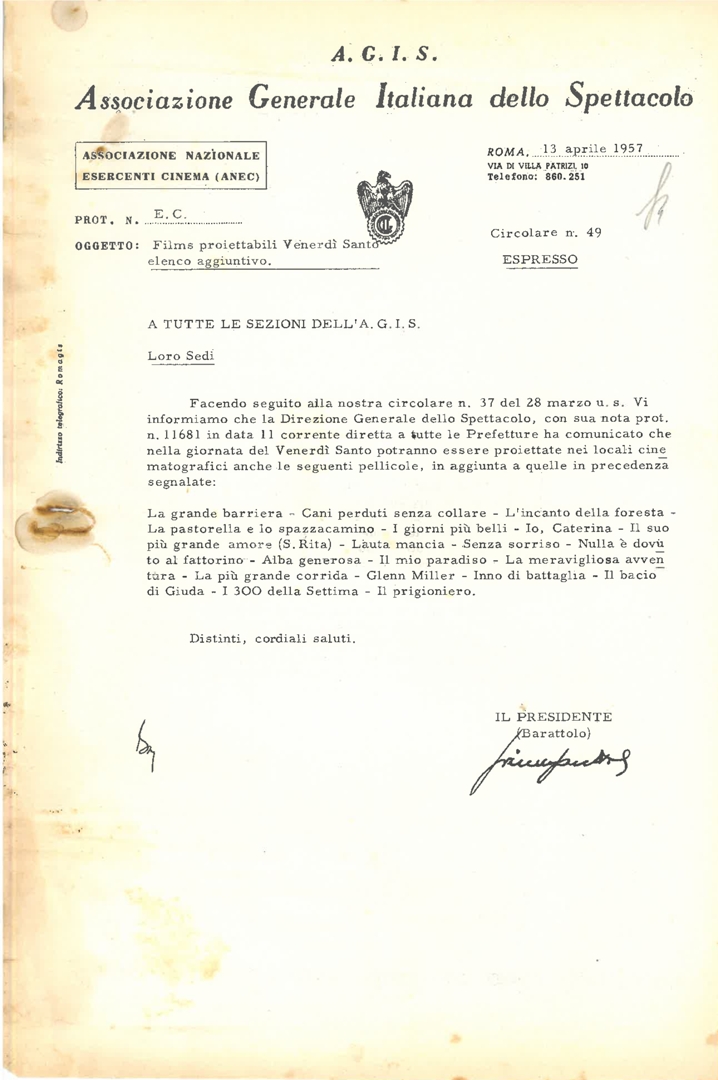 Lettera di Vincenzo Barattolo, presidente dell'Associazione generale italiana dello spettacolo - AGIS, a tutte le sezioni dell'AGIS