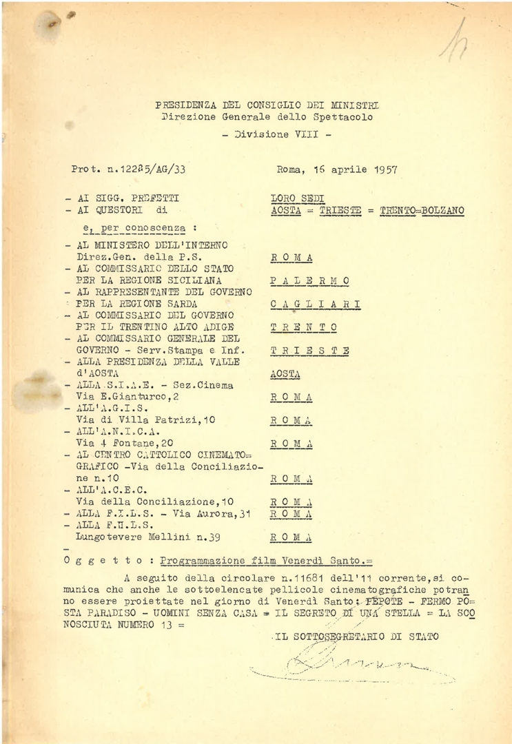 La Direzione generale dello spettacolo comunica un ulteriore elenco di pellicole cinematografiche proiettabili nella giornata del venerdì santo. Dattiloscritto