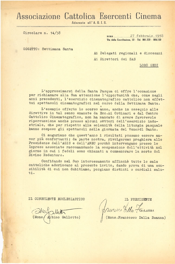 Lettera a firma di mons. Albino Galletto, consulente ecclesiastico dell'Ente dello spettacolo, e di mons. Francesco Dalla Zuanna, presidente dell'ACEC, ai delegati diocesani e regionali e ai direttori dei SAS