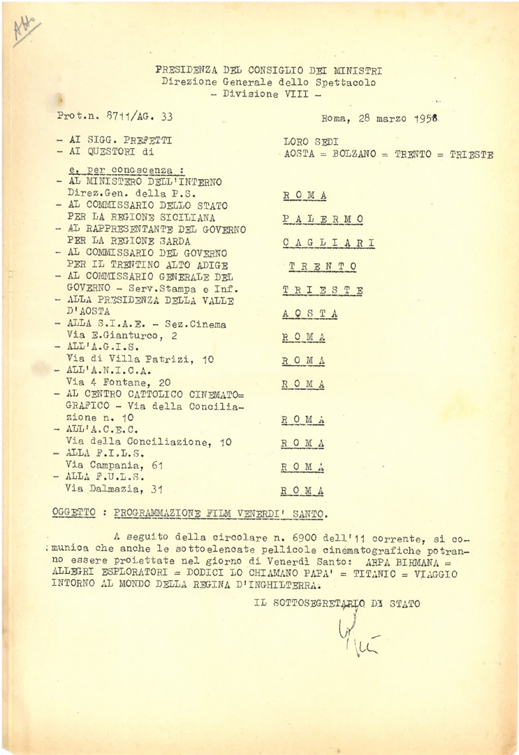 La Direzione Generale dello Spettacolo trasmette un ulteriore elenco di pellicole proiettabili nella giornata del venerdì santo. Dattiloscritto