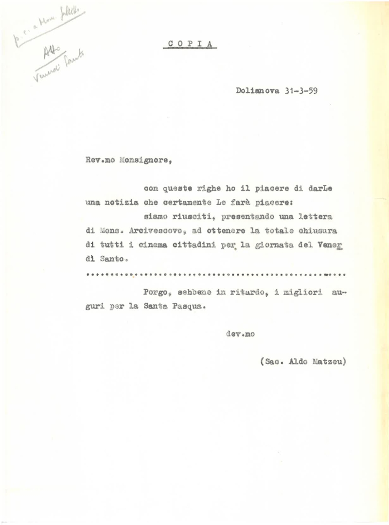Don Aldo Matzeu comunica a mons. Francesco Dalla Zuanna di aver ottenuto la chiusura di tutti i cinema di Dolianova in provincia del Sud Sardegna nella giornata del venerdì santo. Dattiloscritto