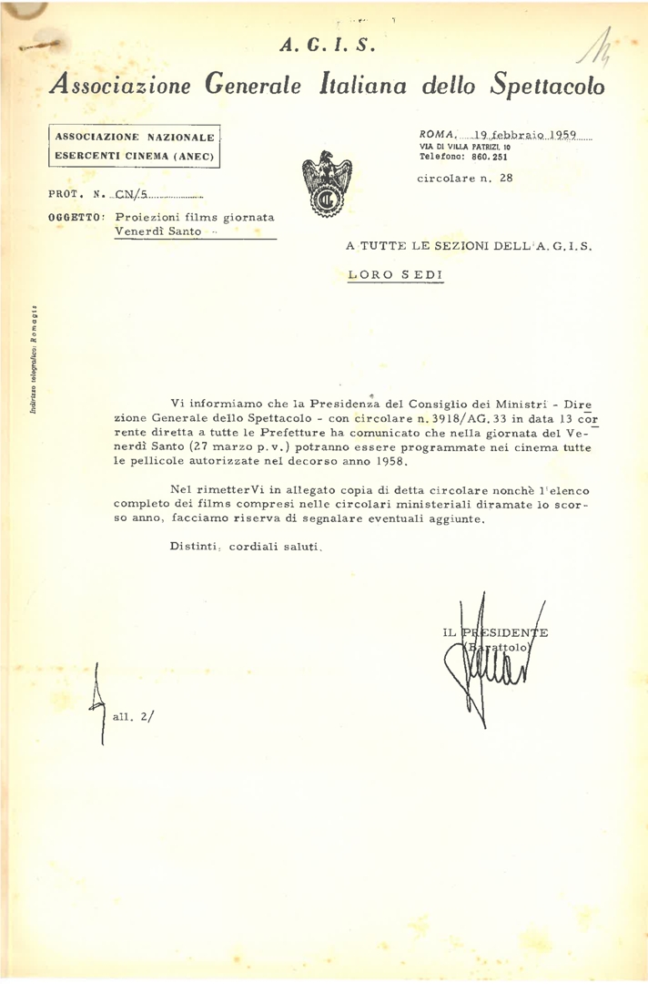 Lettera di Vincenzo Barattolo, presidente dell'Associazione generale italiana dello spettacolo - AGIS, a tutte le sezioni dell'AGIS
