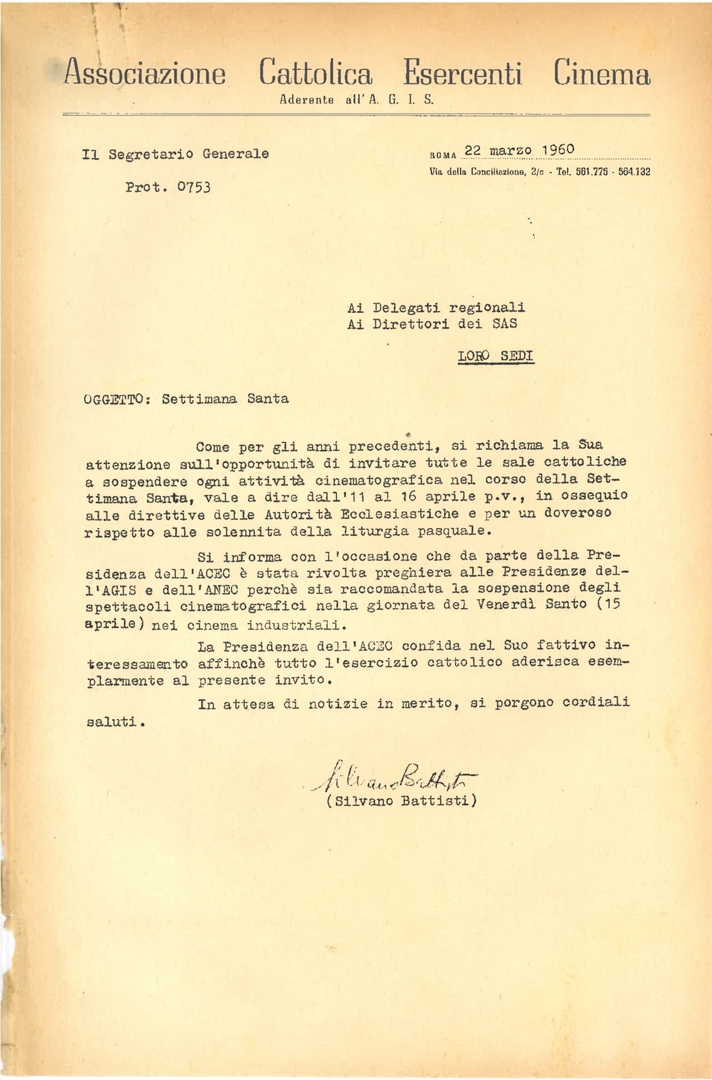 Silvano Battisti invita tutte le sale cattoliche a sospendere ogni attività cinematografica nel corso della settimana santa. Dattiloscritto