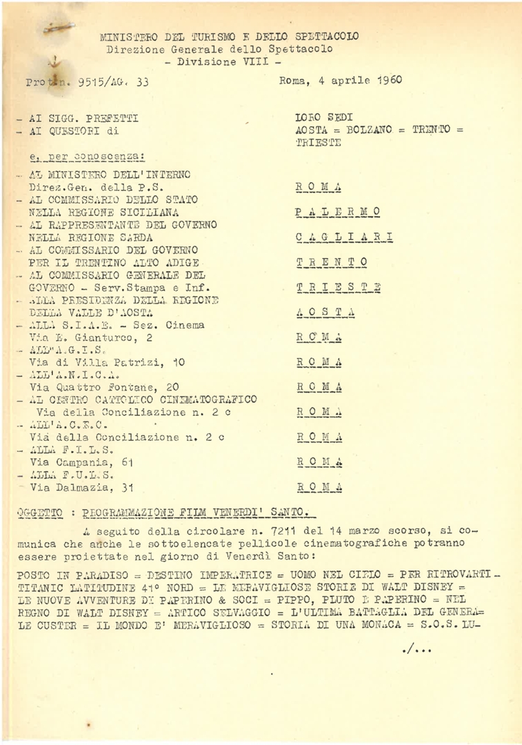 La Direzione generale dello spettacolo, a nome di Umberto Tupini, trasmette un'ulteriore lista di pellicole autorizzate per la proiezione nella giornata del venerdì santo. Dattiloscritto
