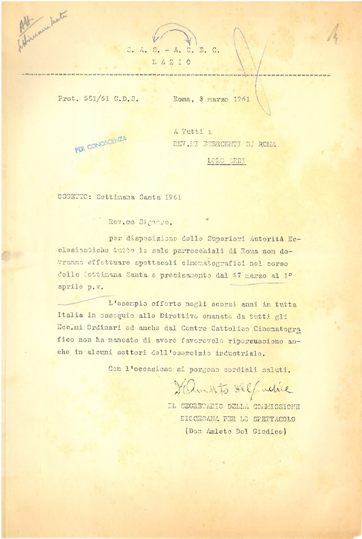 Lettera di don Amleto Del Giudice, segretario della commissione diocesana per lo spettacolo, ai reverendi esercenti delle sale parrocchiali di Roma