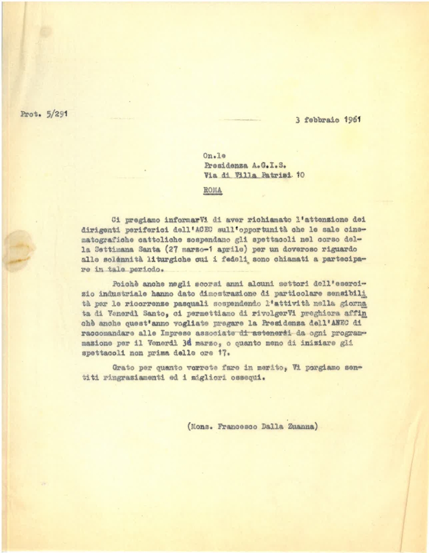 Mons. Francesco Dalla Zuanna chiede al presidente dell'AGIS di intervenire presso l'ACEC in merito alla sospensione degli spettacoli cinematografici nella giornata del venerdì santo. Dattiloscritto