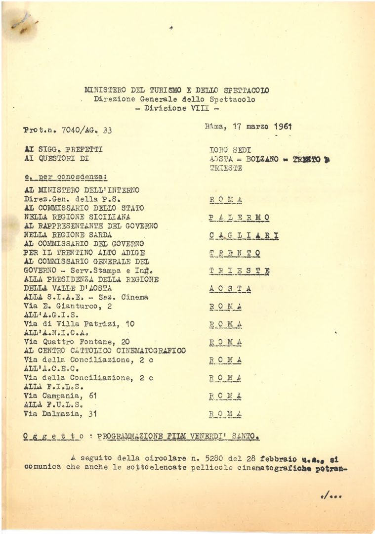 La Direzione generale dello spettacolo, a nome di Umberto Tupini, comunica che nella giornata del venerdì santo potranno essere proiettate solo le pellicole elencate. Dattiloscritto