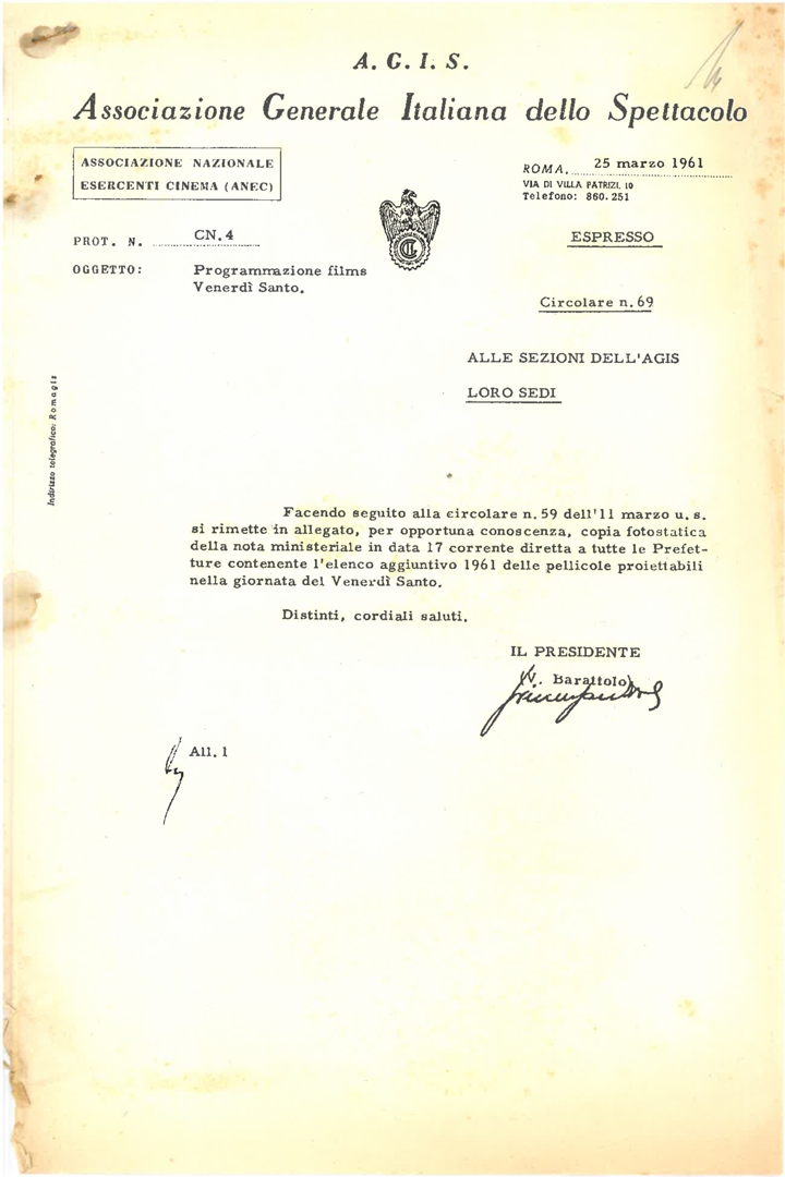 Vincenzo Barattolo trasmette la nota ministeriale e l'elenco dei film autorizzati per la programmazione nella giornata del venerdì santo. Dattiloscritto