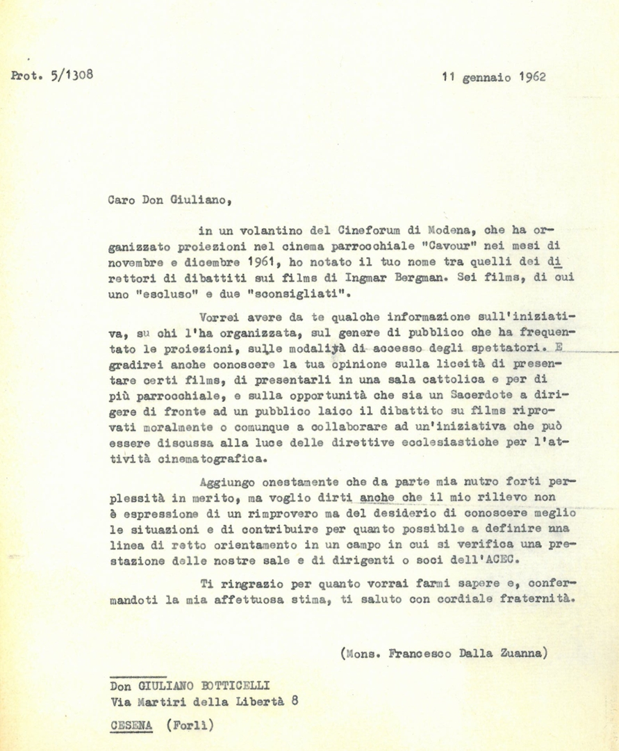 Mons. Francesco Dalla Zuanna scrive a don Giuliano Botticelli in merito alla sua partecipazione ai dibattiti seguiti alla proiezione di film moralmente sconsigliati nel cinema parrocchiale "Cavour" di Modena. Dattiloscritto
