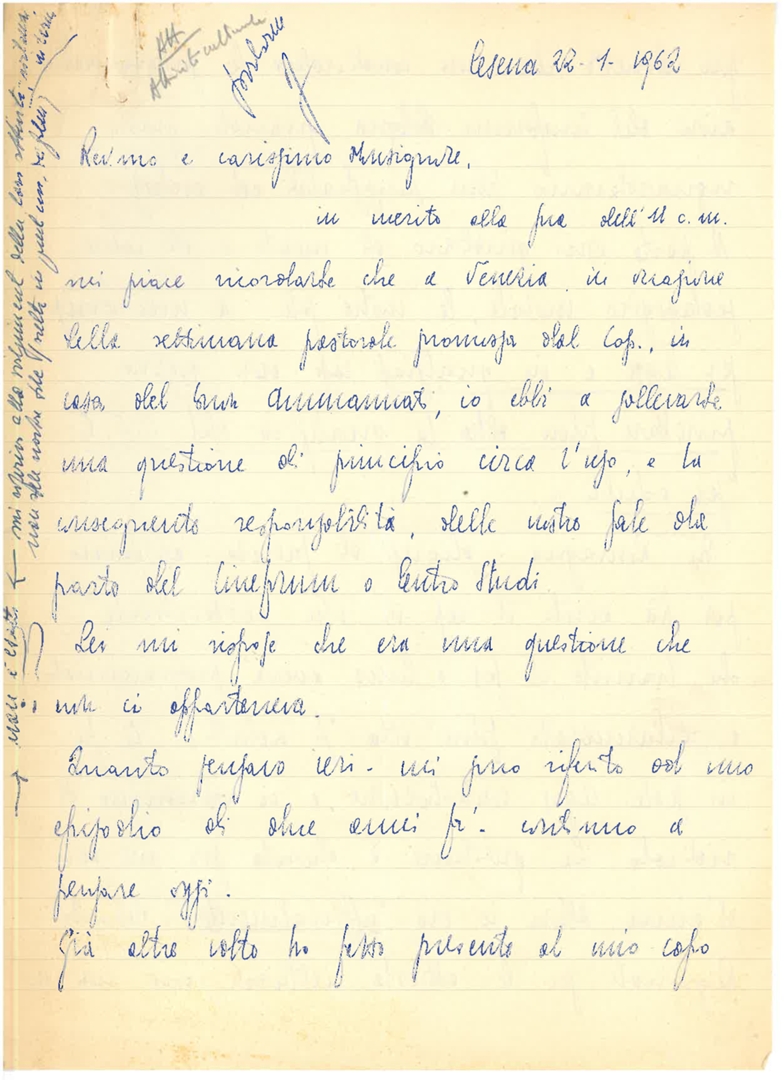 Don Giuliano Botticelli risponde a mons. Francesco Dalla Zuanna a proposito delle responsabilità delle proiezioni di film classificati "per adulti". Manoscritto