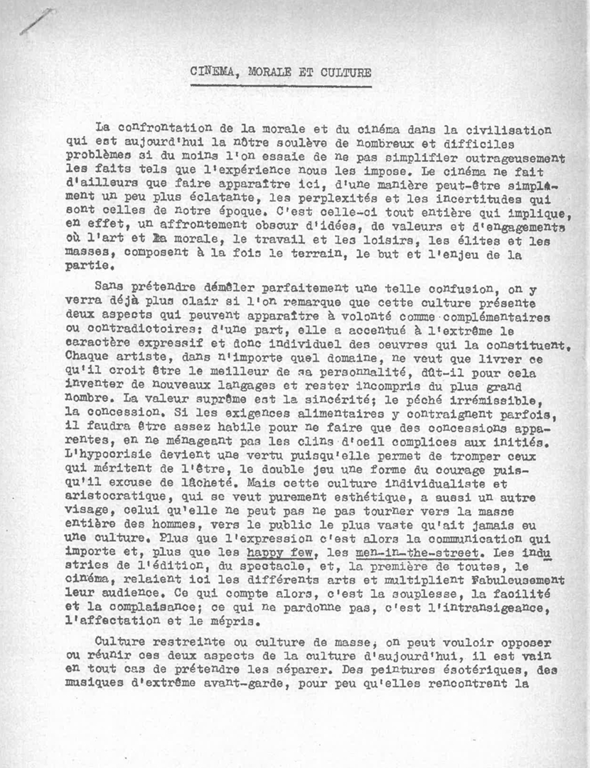 Articolo di Amédée Ayfre apparso su "Etudes" , febbraio 1962. Dattiloscritto