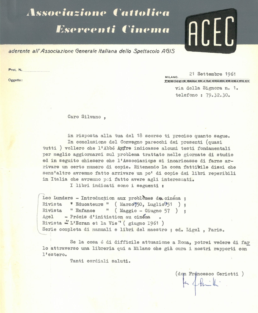 Don Francesco Ceriotti segnala a Silvano Battisti testi utili per lo studio dei rapporti tra cinema e morale. Dattiloscritto