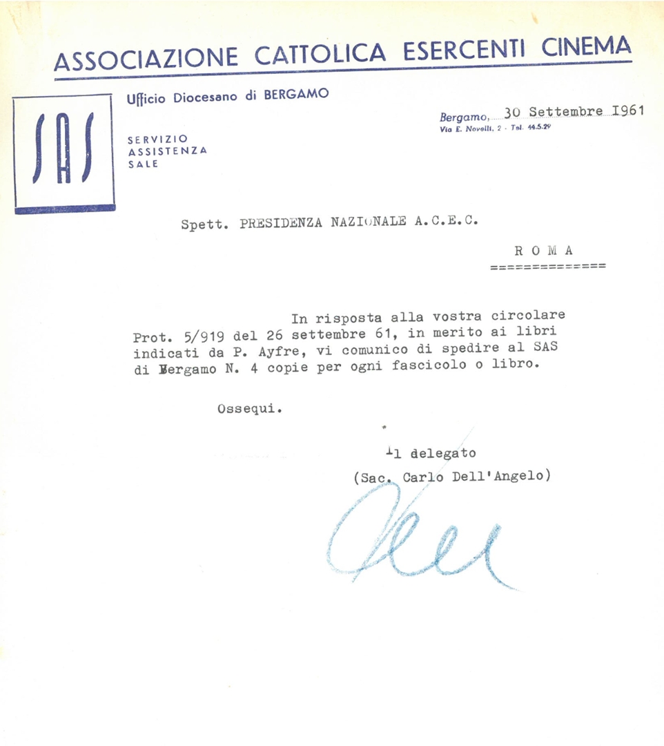 Lettera di don Carlo Dell'Angelo del Servizio assistenza sale - SAS di Bergamo, alla presidenza dell'ACEC