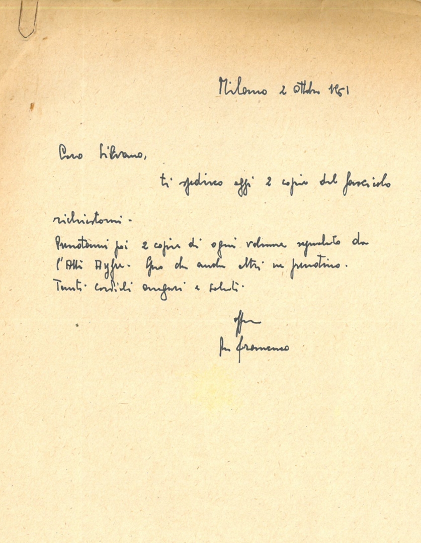 Don Francesco Ceritti comunica a Silvano Battisti la spedizione di copie delle pubblicazioni indicate da padre Amédée Ayfre. Manoscritto