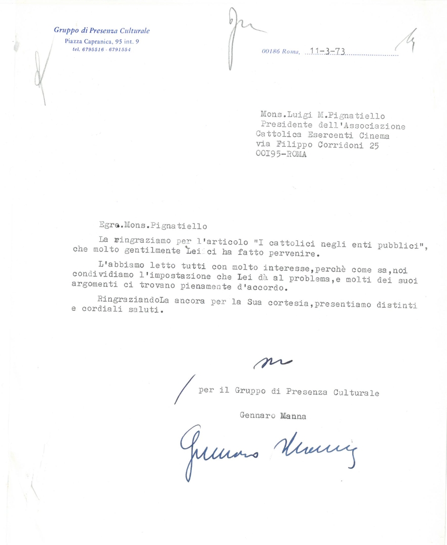 Lettera di Gennaro Manna, a nome del Gruppo di Presenza Culturale, a mons. Luigi Pignatiello, presidente dell'ACEC