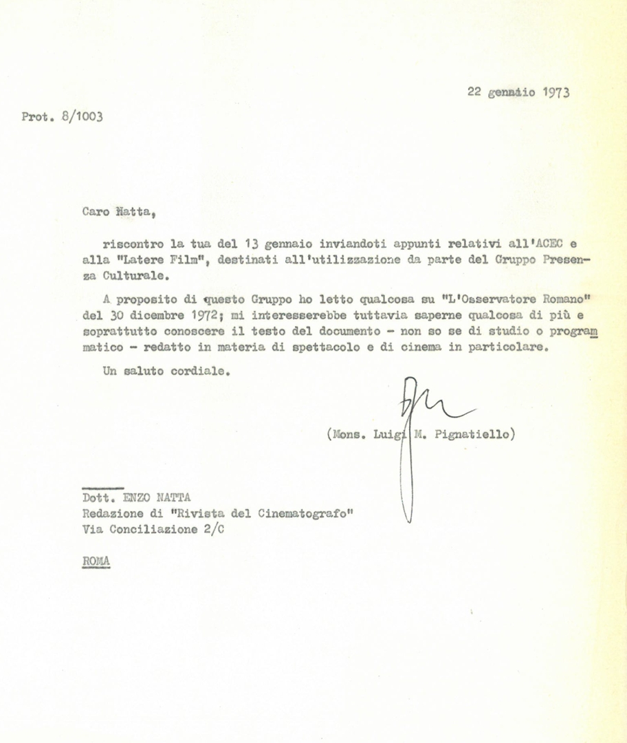 Lettera di mons. Luigi Pignatiello, presidente dell'ACEC, a Enzo Natta, redattore di "Rivista del Cinematografo"