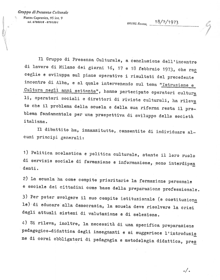 Sui problemi dell'istruzione scolastica e della politica culturale. Dattiloscritto