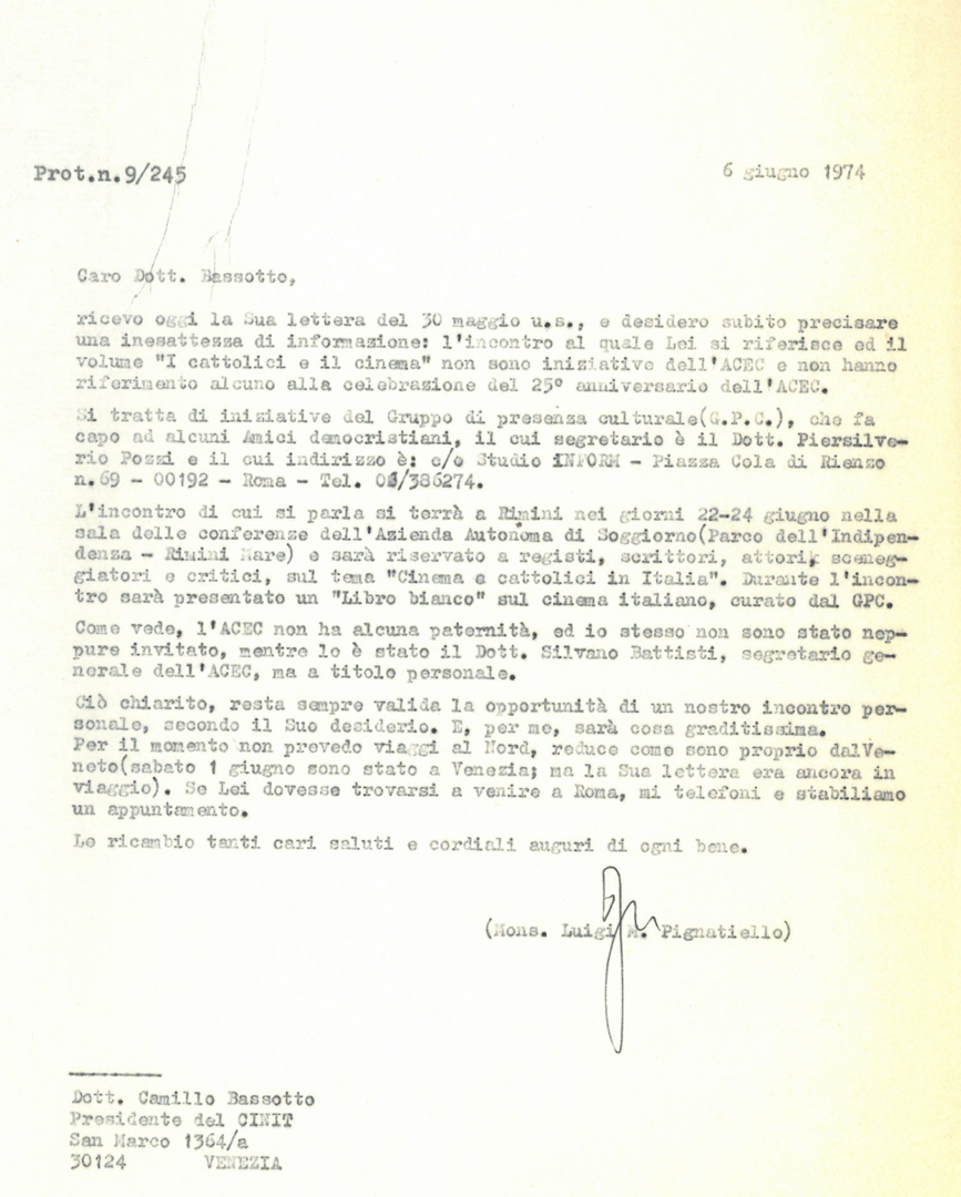 Mons. Luigi Pignatiello fornisce a Camillo Bassotto chiarimenti sulla presenza dell'ACEC e del GPC per quanto riguarda pubblicazioni, iniziative e incontri sui rapporti tra cinema e cattolici Dattiloscritto