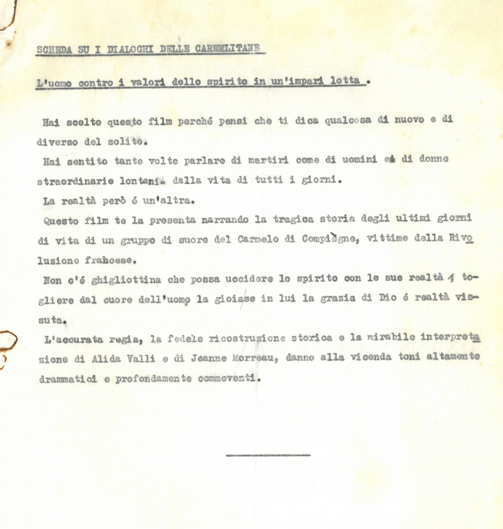 | Film (keywords PRIN 2012) | Les dialogues des Carmélites (I dialoghi delle Carmelitane, Raymond Leopold Burckberger e Philippe Agostini) |