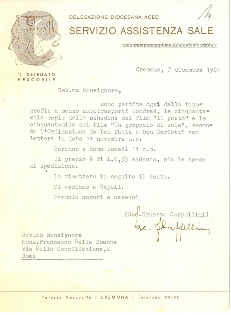 Don Ernesto Cappellini comunica a mons. Francesco Dalla Zuanna la disponibilità delle schede filmografiche ordinate. Dattiloscritto