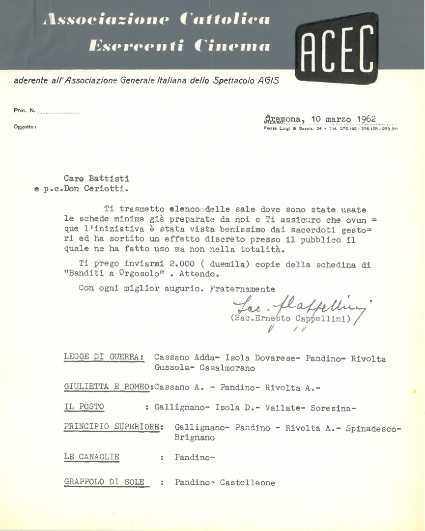 Lettera di padre Brizio Ghensi, responsabile del cinema sociale di Pergola in provincia di Pesaro, a mons. Francesco Dalla Zuanna, presidente dell'ACEC