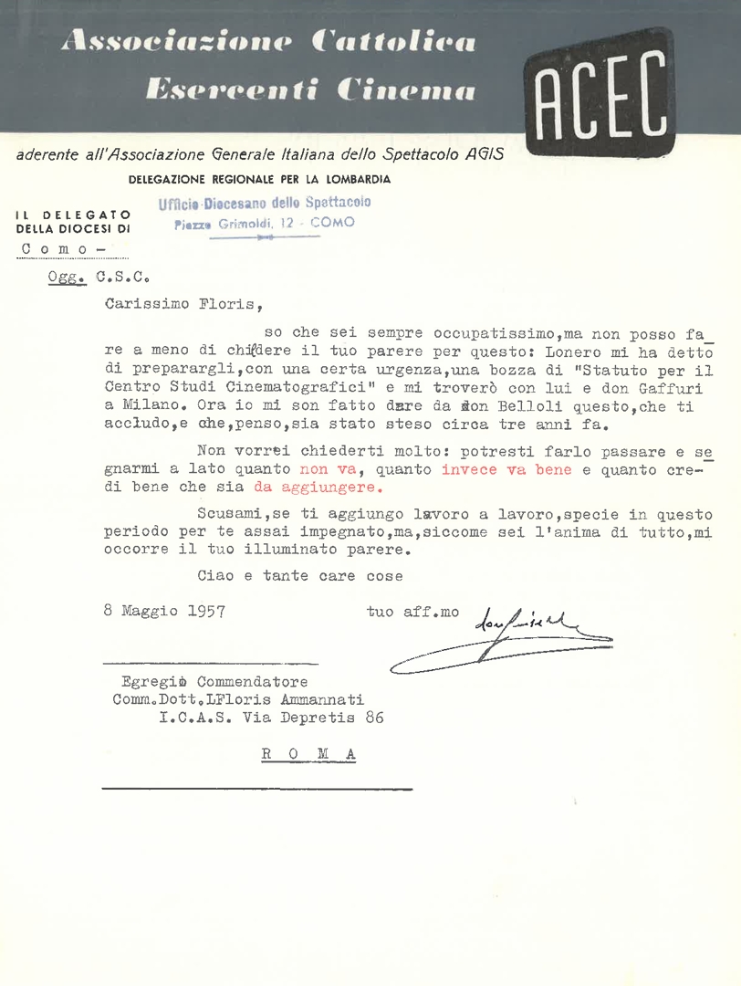 Con lettera di trasmissione di don Giuseppe Fossati, delegato dell'ACEC della diocesi di Como, a Floris Luigi Ammannati, presso Edizioni ICAS. Dattiloscritto