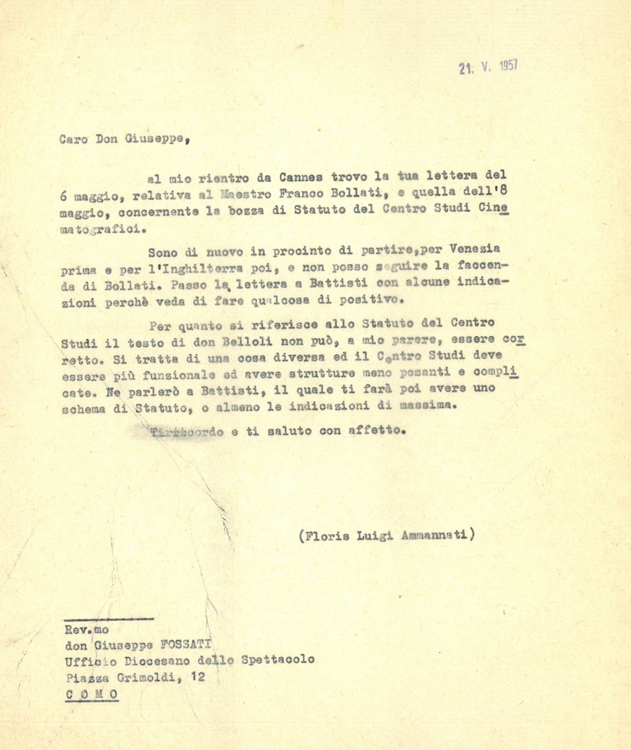 Lettera di Floris Luigi Ammannati a don Giuseppe Fossati, delegato dell'ACEC della diocesi di Como