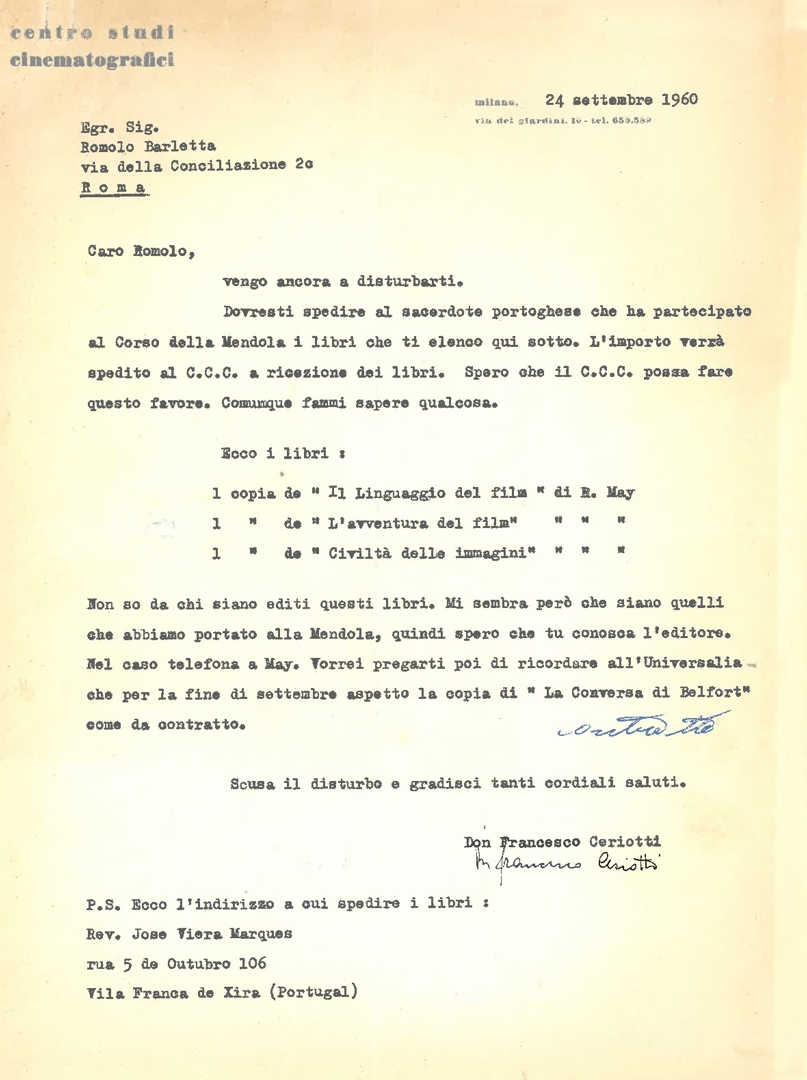 Don Francesco Ceriotti chiede a Romolo Barletta di spedire alcuni libri ad un sacerdote portoghese che ha partecipato al Corso della Mendola. Dattiloscritto