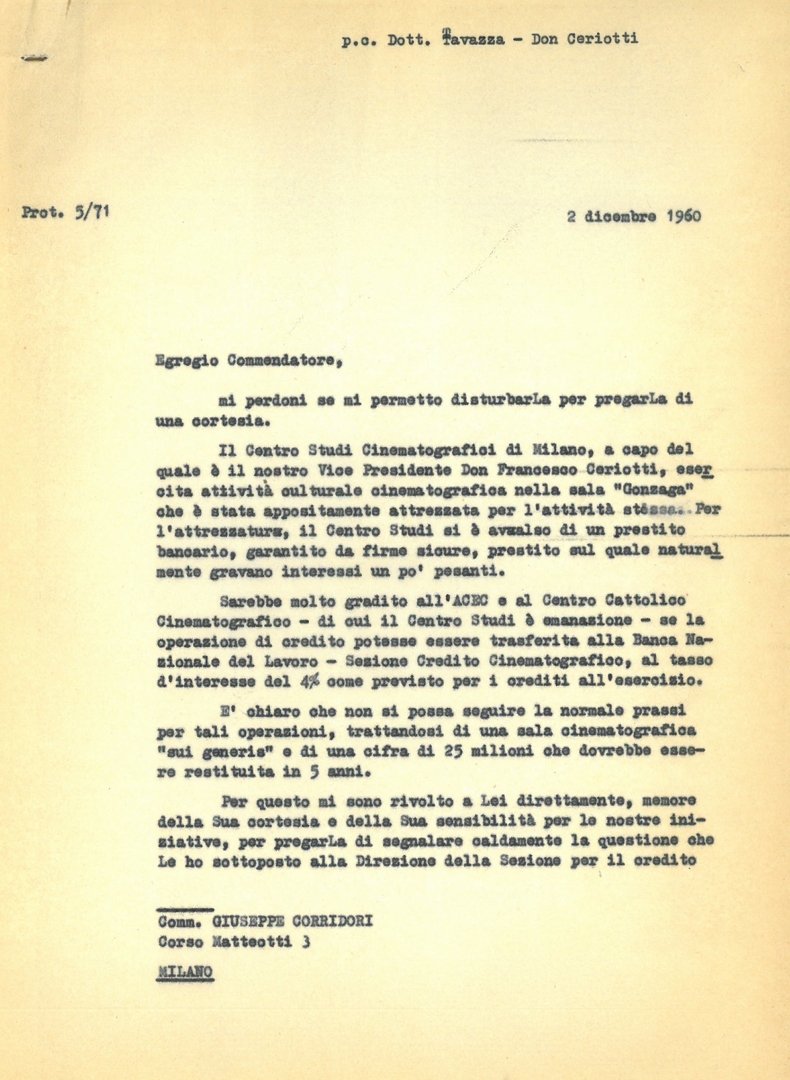 Mons. Francesco Dalla Zuanna scrive a Giuseppe Corridori in merito ad alcune operazioni bancarie del Centro studi cinematografici - CSC di Milano presso la Banca nazionale del lavoro - BNL Dattiloscritto