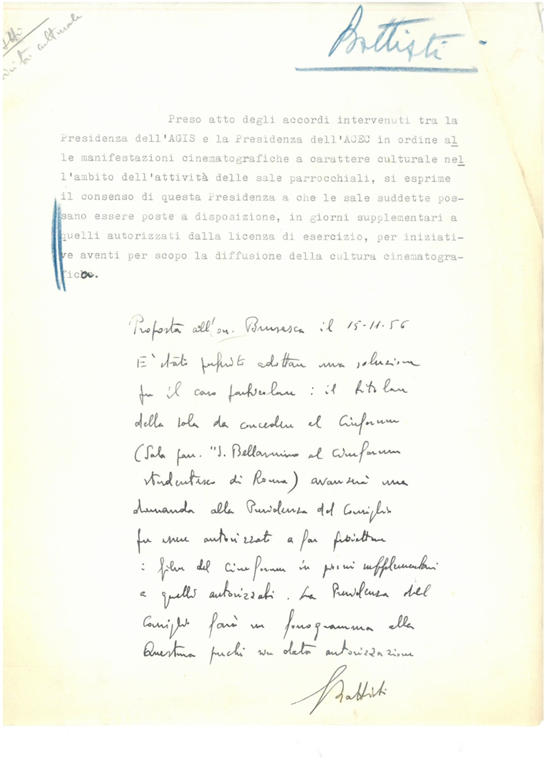 Silvano Battisti rende noti gli accordi tra la presidenza dell'AGIS e la presidenza dell'ACEC in merito alle manifestazioni cinematografiche a carattere culturale nell'ambito dell'attività delle sale parrocchiali e conferma la disponibilità delle sale ad ospitare altre iniziative di cultura cinematografica. Dattiloscritto e manoscritto