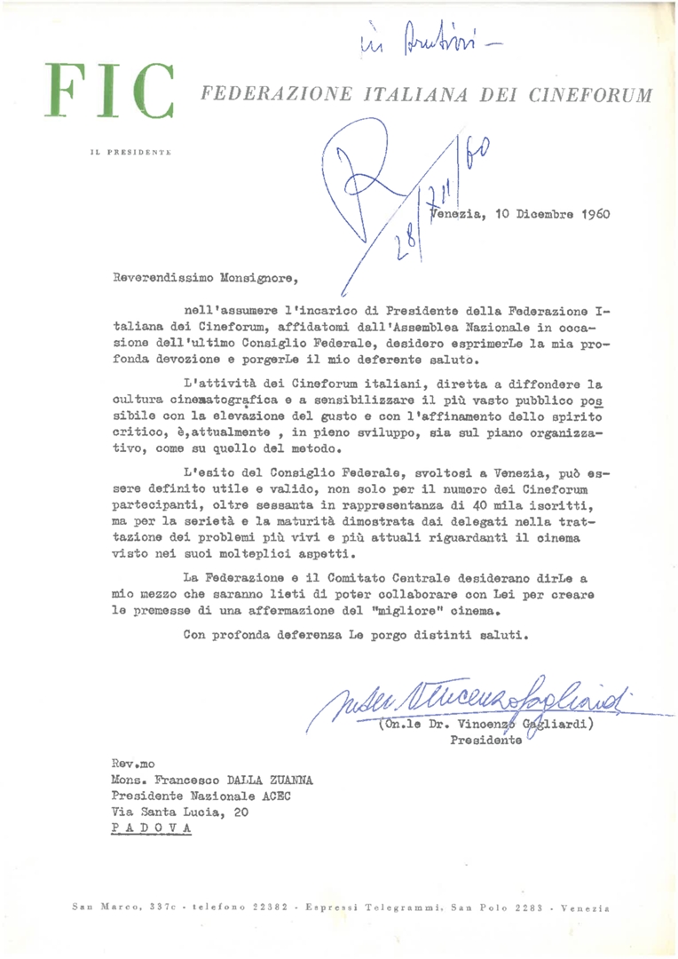 Lettera di Vincenzo Gagliardi, presidente della Federazione italiana cineforum - FIC, a mons. Francesco Dalla Zuanna, presidente dell'ACEC
