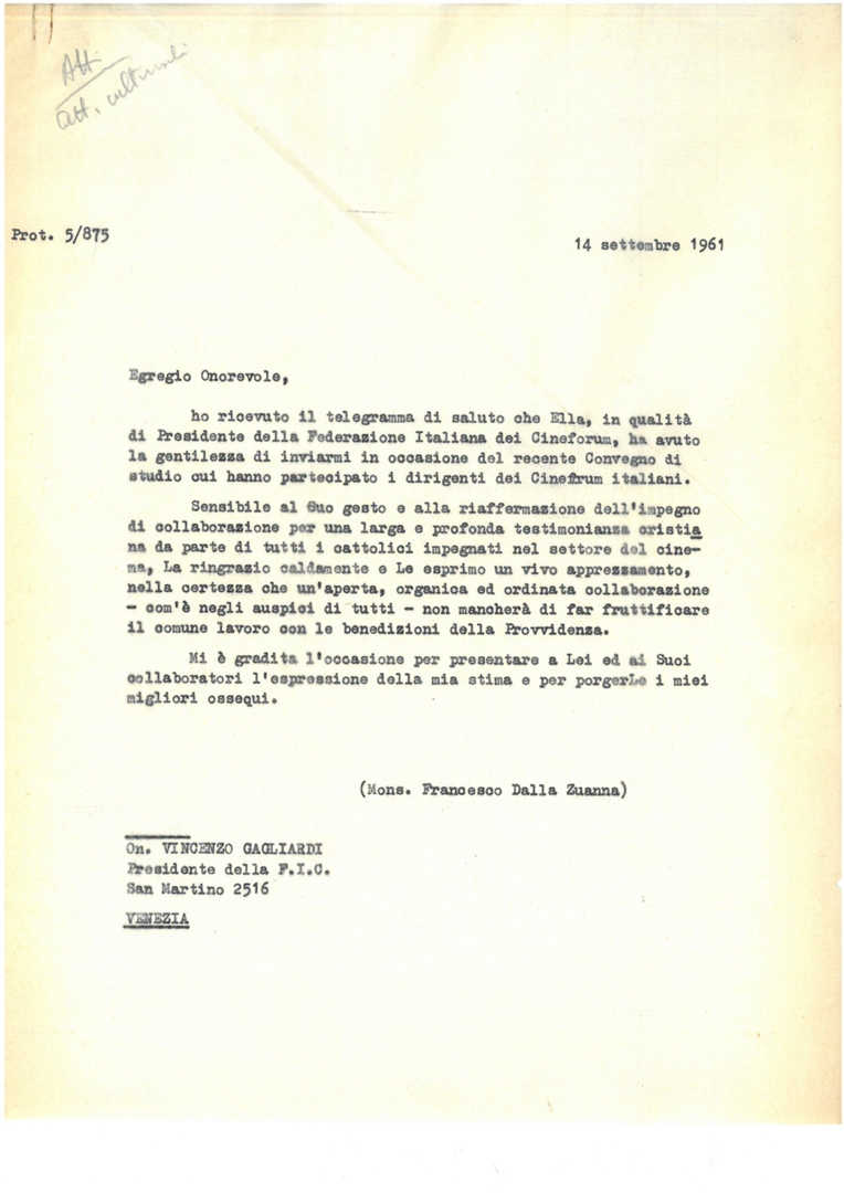 Lettera di mons. Francesco Dalla Zuanna, presidente dell'ACEC, a Vincenzo Gagliardi, presidente della Federazione italiana cineforum - FIC